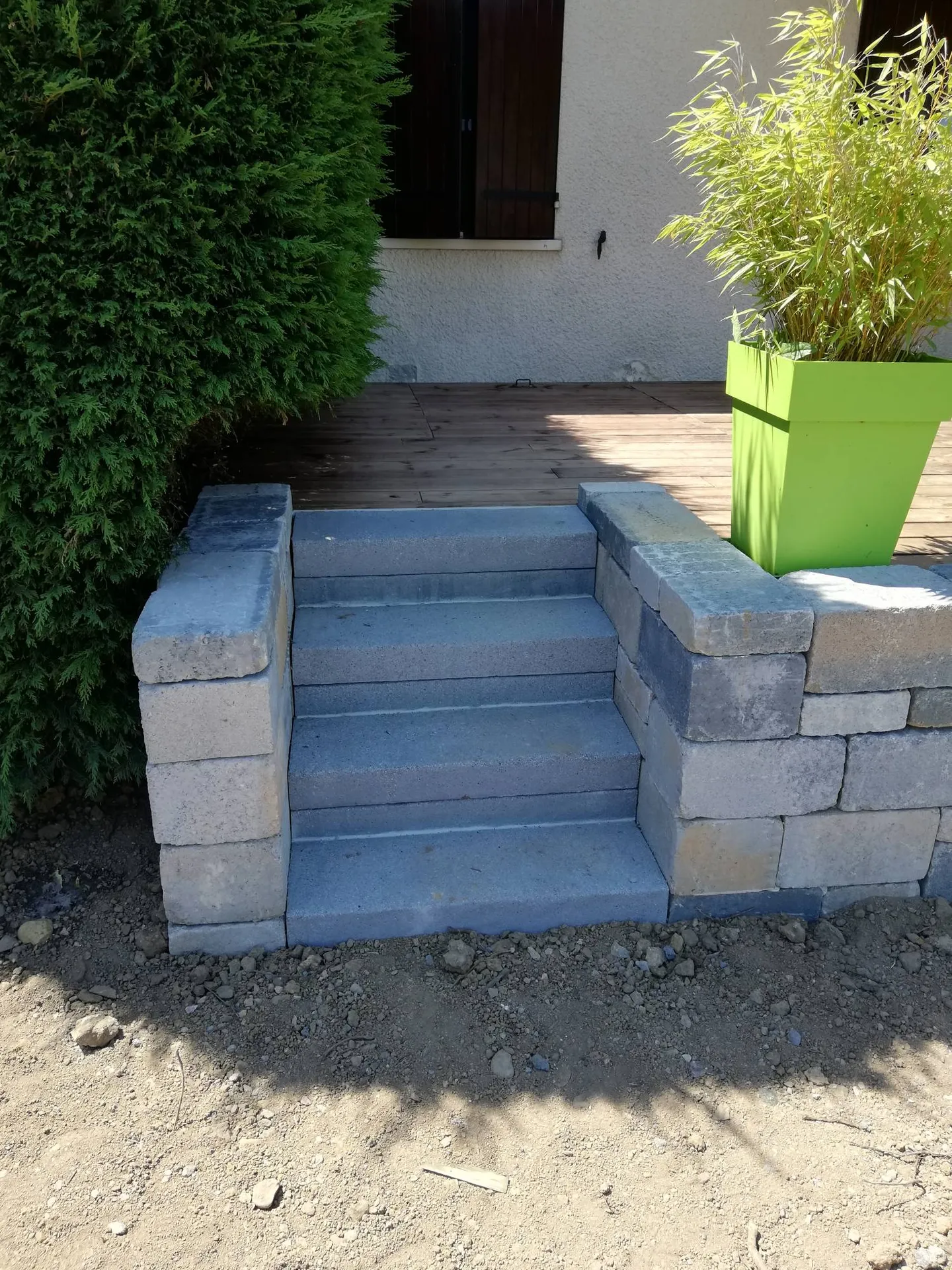 Le choix d'un muret en bloc avec l’accompagnement d'une terrasse en bois correspondaient totalement au style et choix du client.