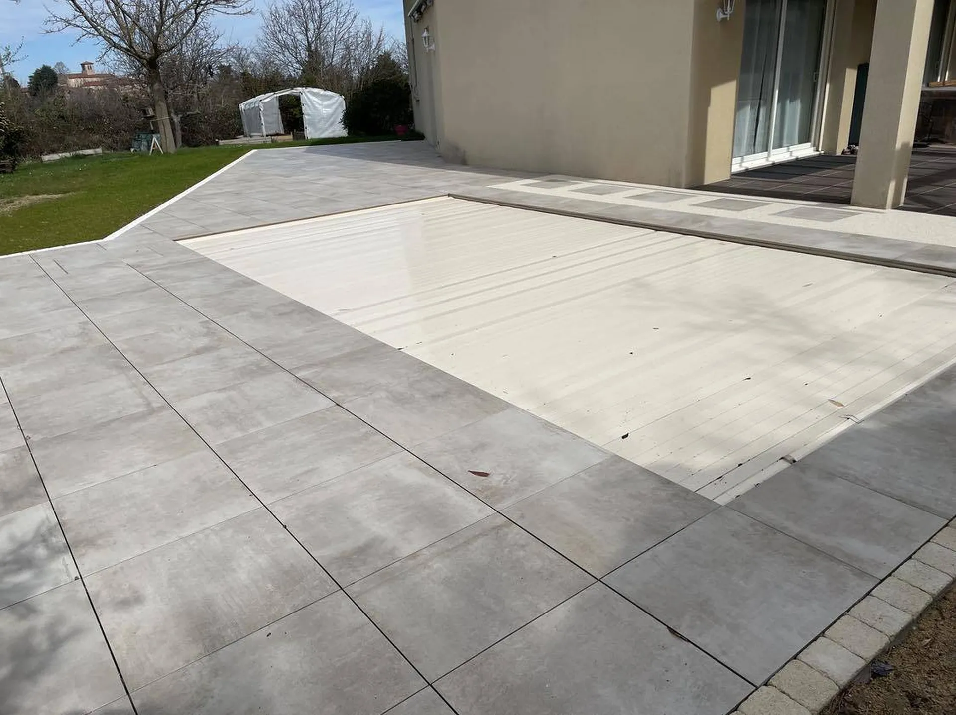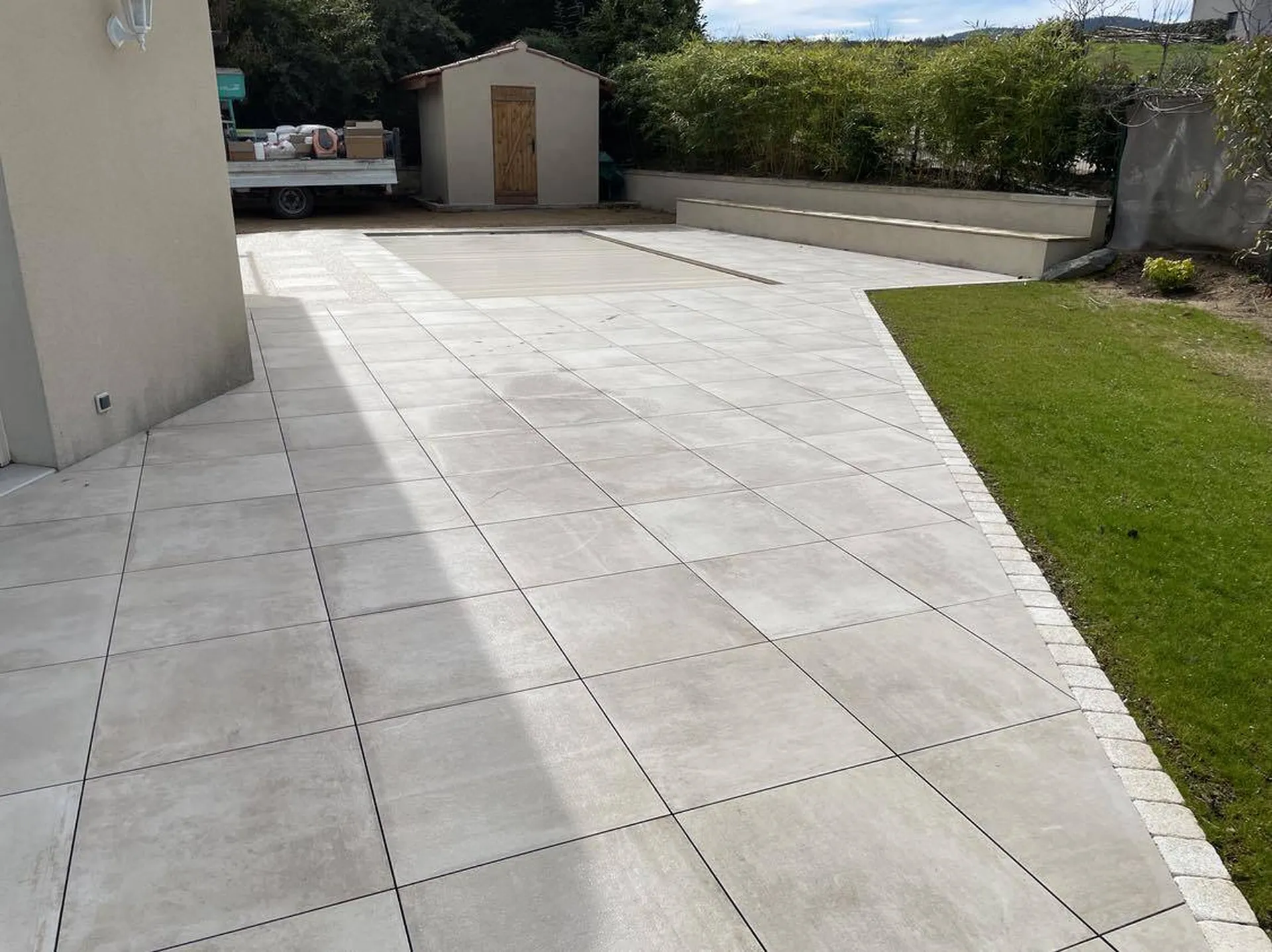 Ici notre client souhaitait agrandir et améliorer son sols de plage de piscine, nous lui avons proposé la pose de grès cérame sur plots afin de pouvoir nous adapter aux différents niveaux de terrains présents au début du chantier,
