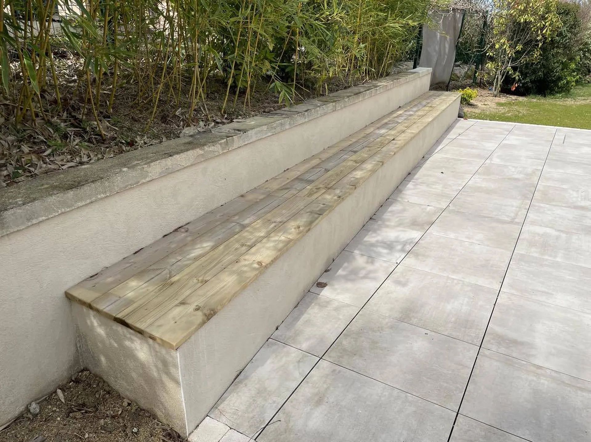 Nous avons agrémenté le muret d'une banquette avec un revêtement en bois pour pouvoir se détendre et poser les serviettes durant la baignade.