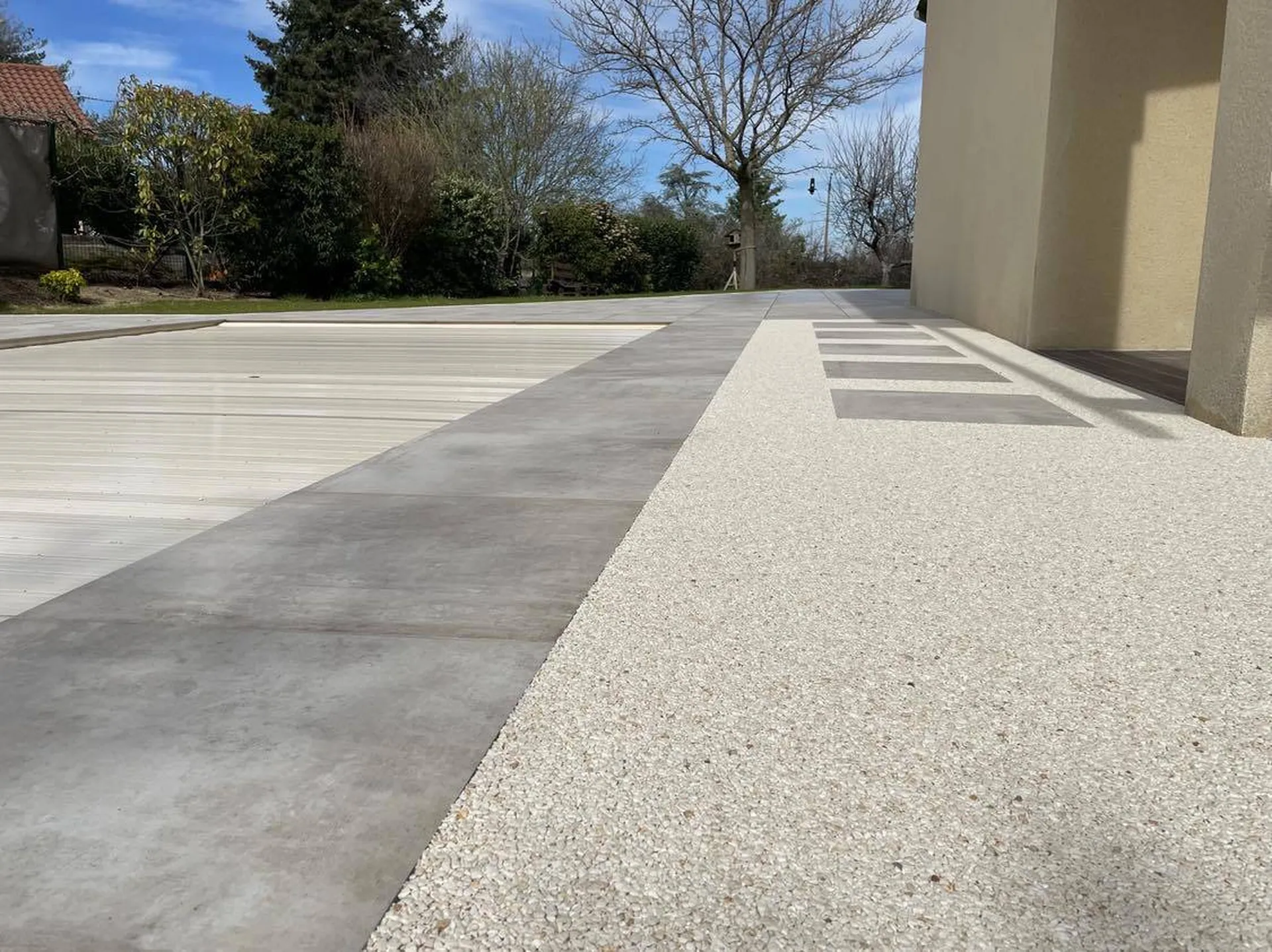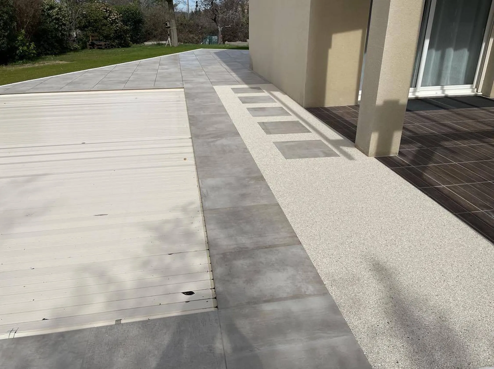 Sur la partie qui joint la plage de piscine à l'ancienne terrasse déjà présente nous avons créé une allée avec le revêtement drainant RESINEO avec l'intégration de pas japonais avec des carreaux issus de la terrasse en gres ceram.