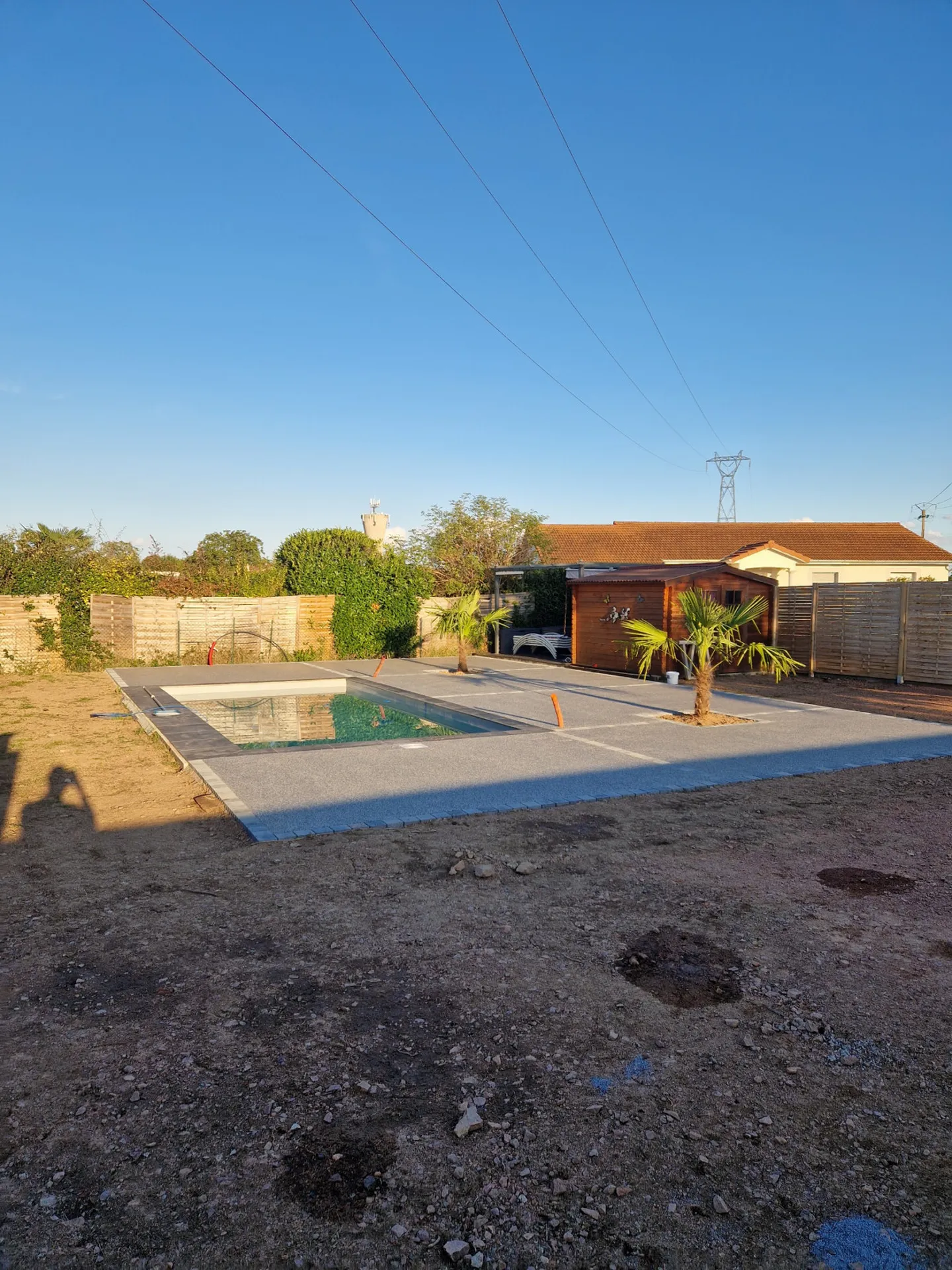 Notre client a fait le choix de faire réaliser une terrasse en resineo drain quartz. Ce revêtement drainant et antidérapant et parfaitement conçu pour ce type d'installation. Nous avons ajouté des bordures en pavés de délimitation pour habiller le revêtement de la plage de la piscine .