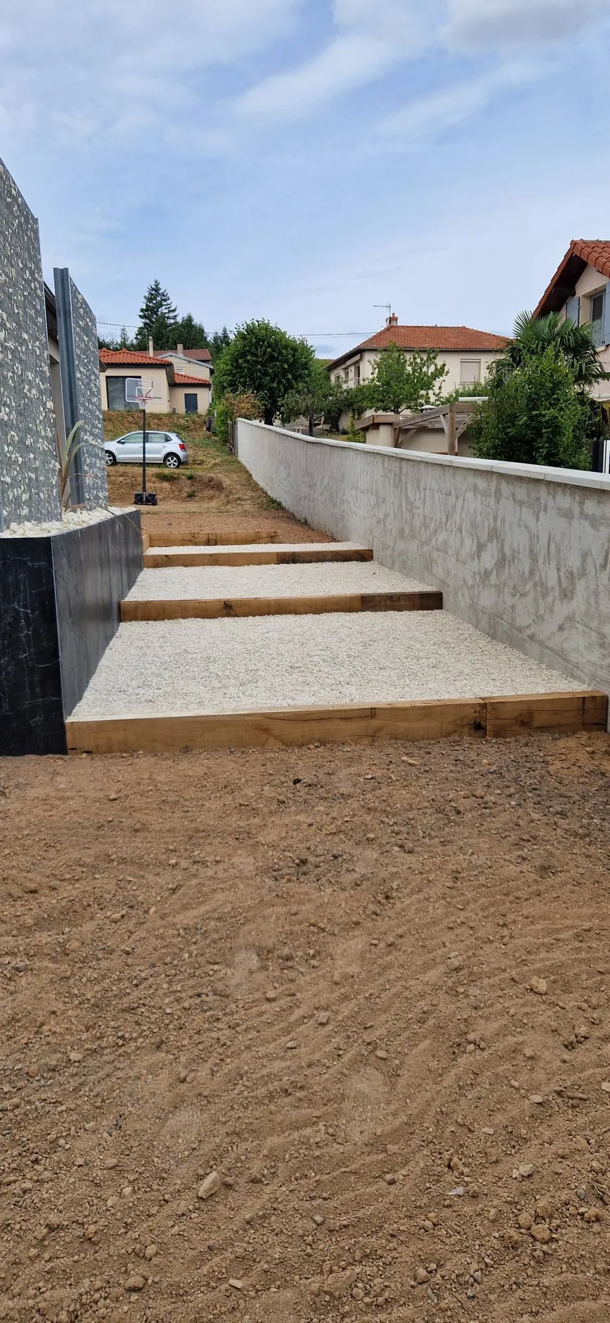 un escalier en gravillon est en traverse chêne permet l'accès au bas du terrain .