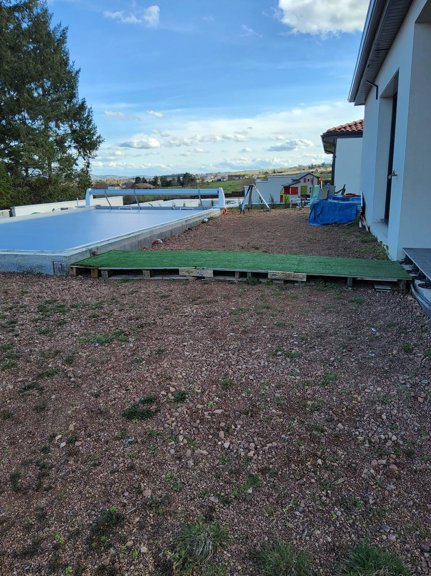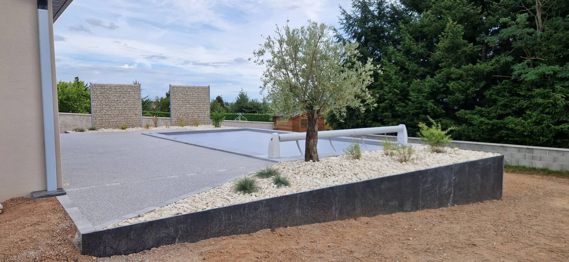 Nous avons réalisé pour cela un muret en dalle d'ardoise afin de définir l'espace de la place de piscine, pour la terrasse nous avons optez pour une plage en resineo drain quartz pour son pouvoir drainant et antidérapant,